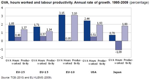 @gshibayamaさんのブログに「日本の生産性は低いのか?」というエントリに興味深いパワーポイントが紹介されていた。 その“Productivity in Europe. From the expansion to the crisis”というタイトルのPPTで掲載されていたのが以下のグラフである。 前半の…